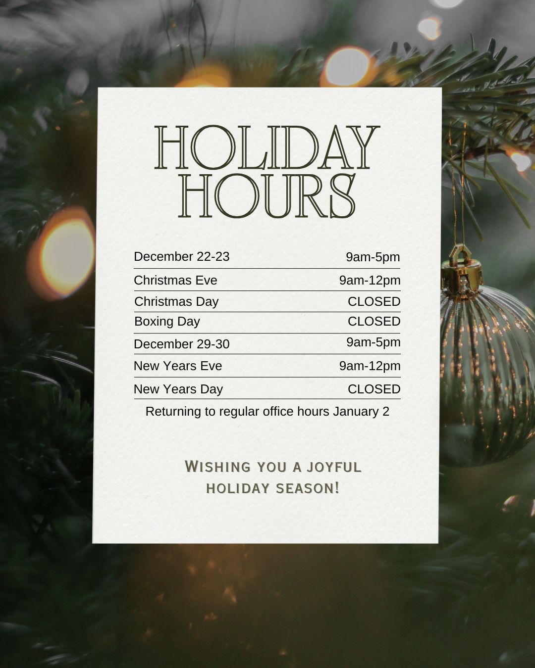 Please take note of our adjusted holiday hours as we take time to enjoy the festive season.