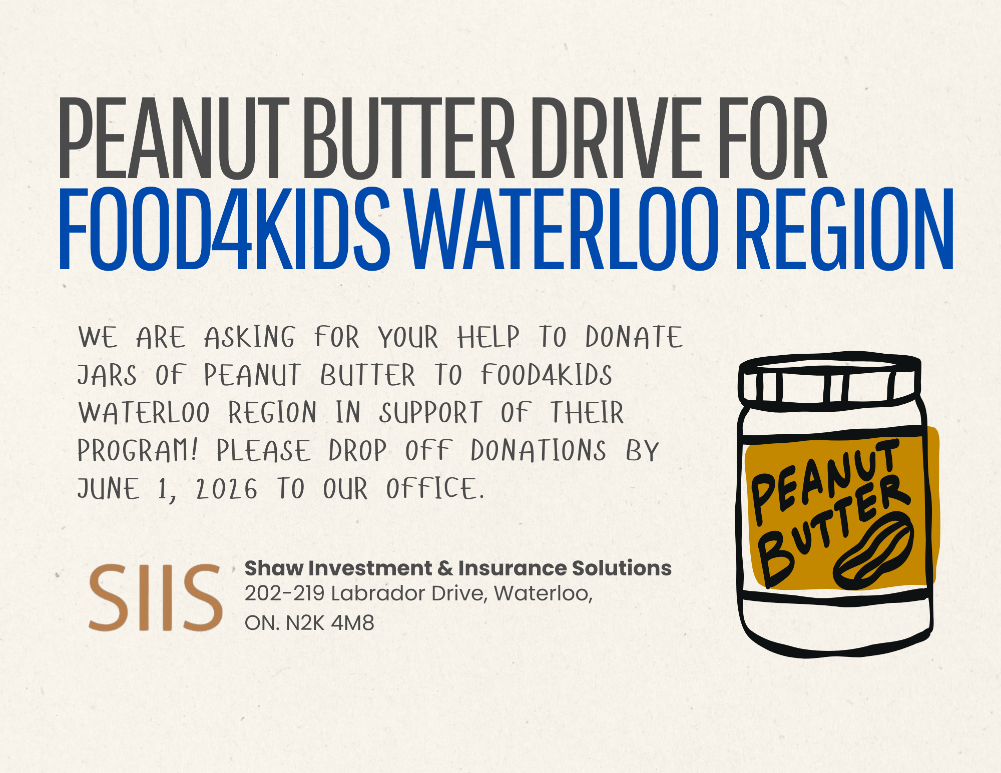 Shaw Investment & Insurance Solutions is asking for your help to donate jars of peanut butter or wow butter to support Food4Kids Waterloo Region. Our goal is to surpass last year's collection of 443 jars! Please drop off any donations to our office by June 1, 2026.